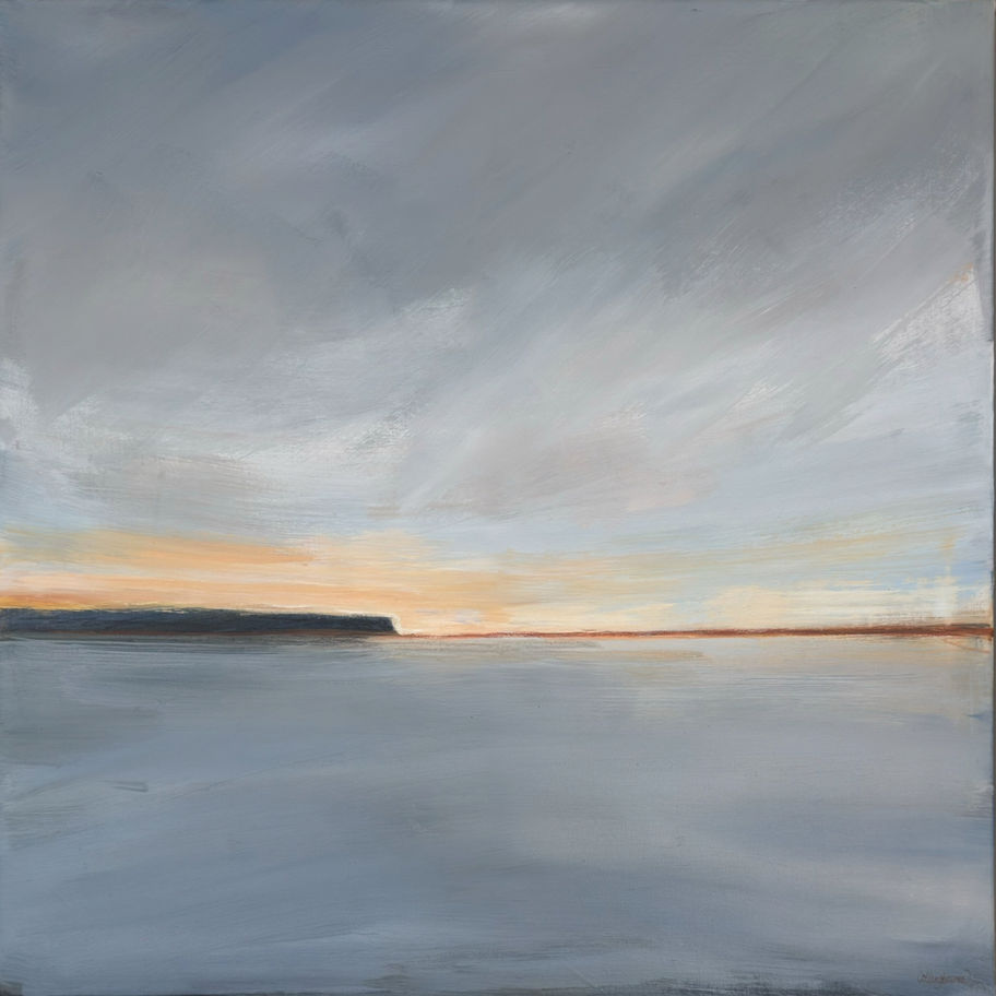 Richly layered and textured, this painting was inspired by a visit to Orkney, where the horizon line of distant islands and cliffs seemed magical to me: a meeting of calming colours and hopeful destinations.