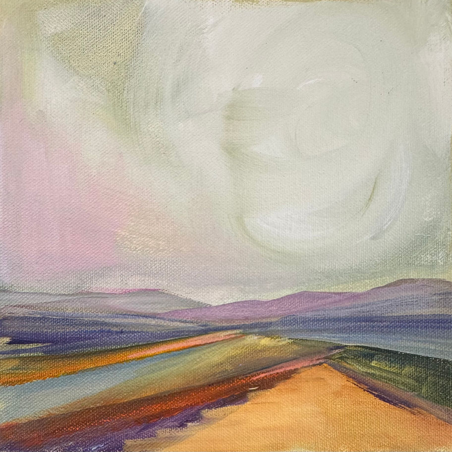 An abstracted view of a Scottish landscape, where a muted palette of yellow ochre, green and violet captures the quiet beauty of a path leading into distant hills.